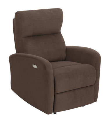 Featuring a contemporary silhouette, this compact power recliner is perfect for smaller apartments and living rooms.upholstered in a linen-like fabric, this recliner is soft to the touch and invites you to kick back for a nap or to read a good book.it's plush headrest and track like arms offer a more modern aesthetic.the recliner also features a motorized power function that adjusts to the perfect angle, operated by a shiny stainless steel switch panel.available in multiple colors, this recliner can fit into your existing color palette with ease.