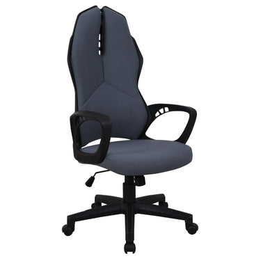 Ultra-modern with a dark grey fabric, this contemporary office chair features a unique backrest design. with a plushly padded backrest and seat, this office chair invites you to work in complete comfort. its tall backrest also features a prong-like angular shape that conforms to your spine and hips, offering an ergonomic design. with black trim on the slim open arms and mobile wheeled base, this office chair projects a two-tone look that works with existing home office colors and decor styles. conveniently roll around the office to retrieve paperwork or scoot it beneath the desk.