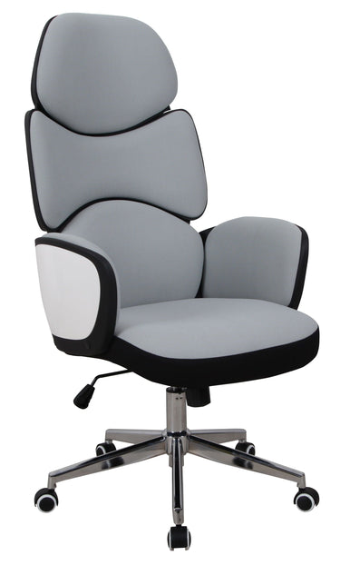 Rest comfortably at your desk with this contemporary office chair. slim flared arms cradle the seat while a tall padded backrest offers long-lasting ergonomic support. along the backrest are three separate pads, each one offering additional comfort along the spine, neck and shoulders. with a two-tone design, this stylish office chair is easy to match existing color palettes, with a soft light grey upholstery outlined in a black trim with a crisp white high gloss finish that adds a bold brightness on each arm exterior. in addition, this mobile office chair rests on a wheeled base in a polished chrome finish.