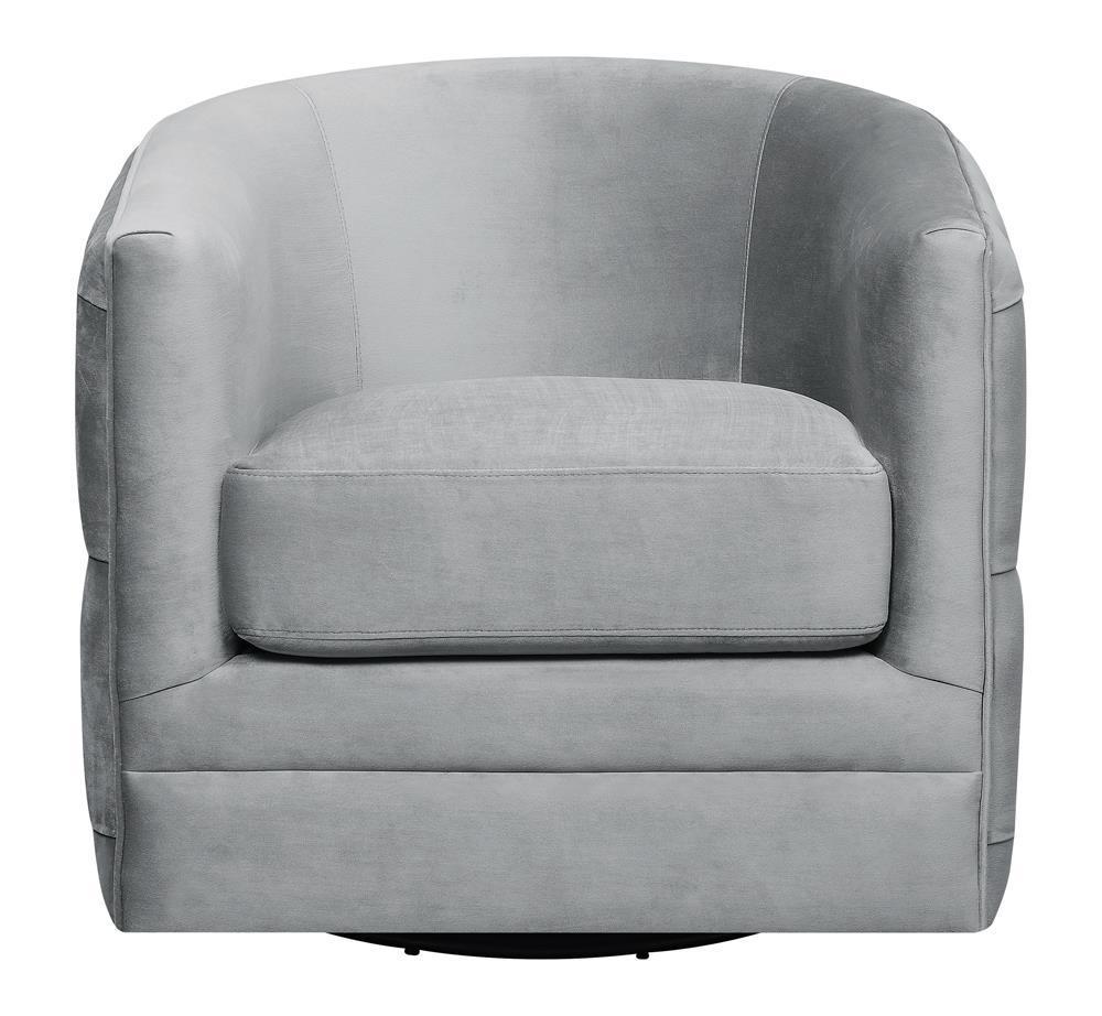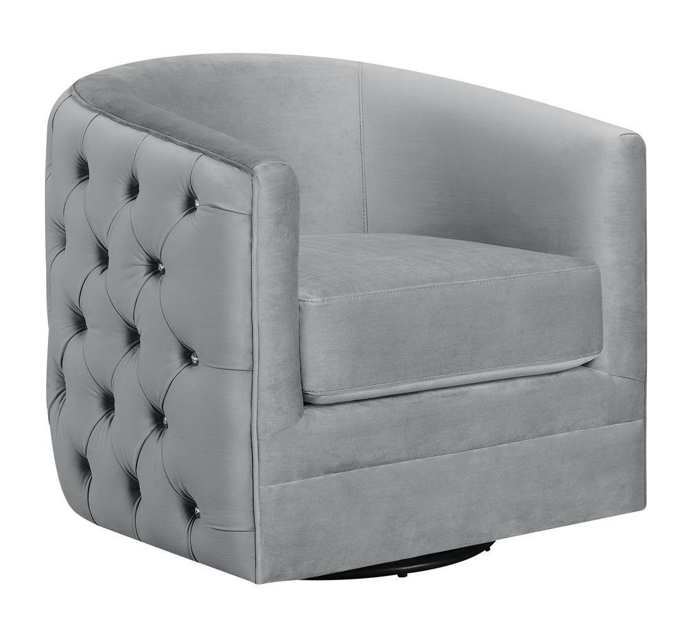 Create a stunning visual with the chic, stunning shape of this accent arm chair. dress up a living room with the soft silver upholstery, full of elegant button tufting. completely upholstered, the cushions are ready to sink into. neutral colors and soft edges meet to create a sophisticated piece that adds style and comfort. luxury and comfort marry for a sensational piece of decor.