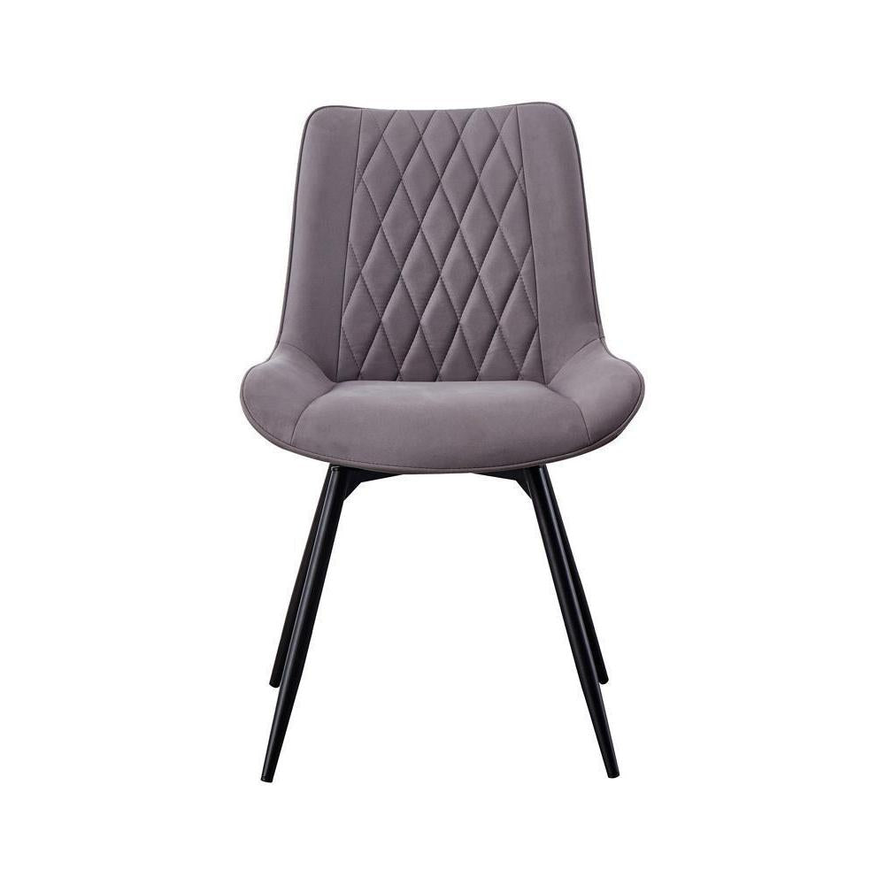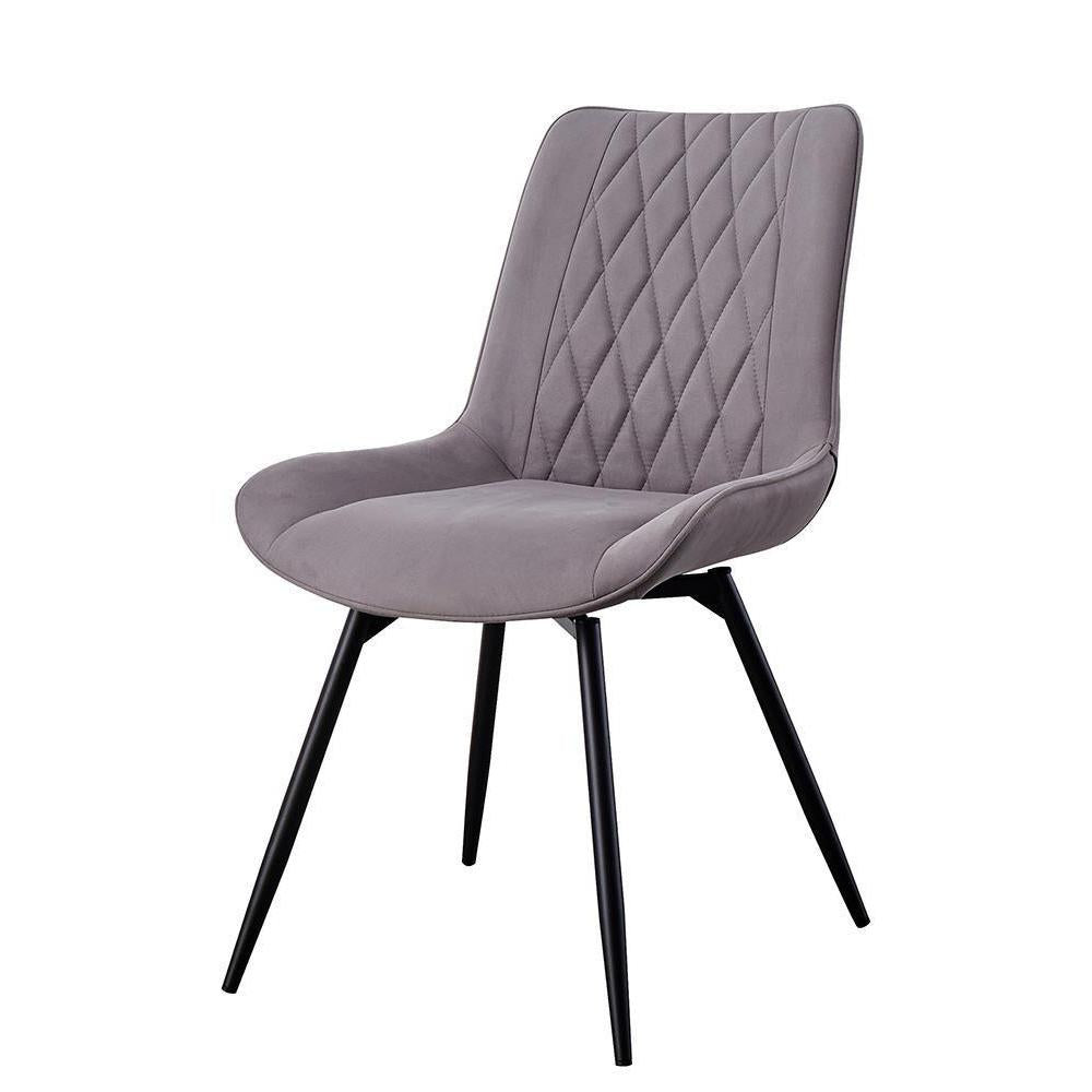 Wrapped in fabric with a diamond quilted interior strip, this pair of dining chairs offer a neutral color that works well with existing decor. slim tapered and flared legs in a gunmetal finish lend a retro-inspired vibe, while the padded bucket seat offers comfort and long-lasting support for casual snacks at kitchen nook or formal meals in a dining space. in addition, each chair features a cradle-like seat situated on a swivel mechanism, allowing guests to come and go easily. place this pair of swivel dining chairs aside a small round cafe style table or complete a media room communal space, lending a funky playful flair. to add, each chair offers a tall backrest for long-lasting comfort and support while playing games and conversing over long meals.