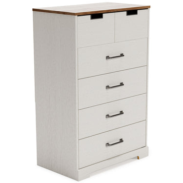 Fresh and inviting, this chest is truly versatile. A crisp white painted finish with a subtle replicated wood grain brings light to your room, while a warm brown finish accents the top. Design details include metal cut-out openings along the upper drawer, with the lower drawers paired with metal handles in an antiqued nickel-tone finish. Five smooth-gliding drawers provide plenty of extra storage, so there's no excuse for a messy room.
