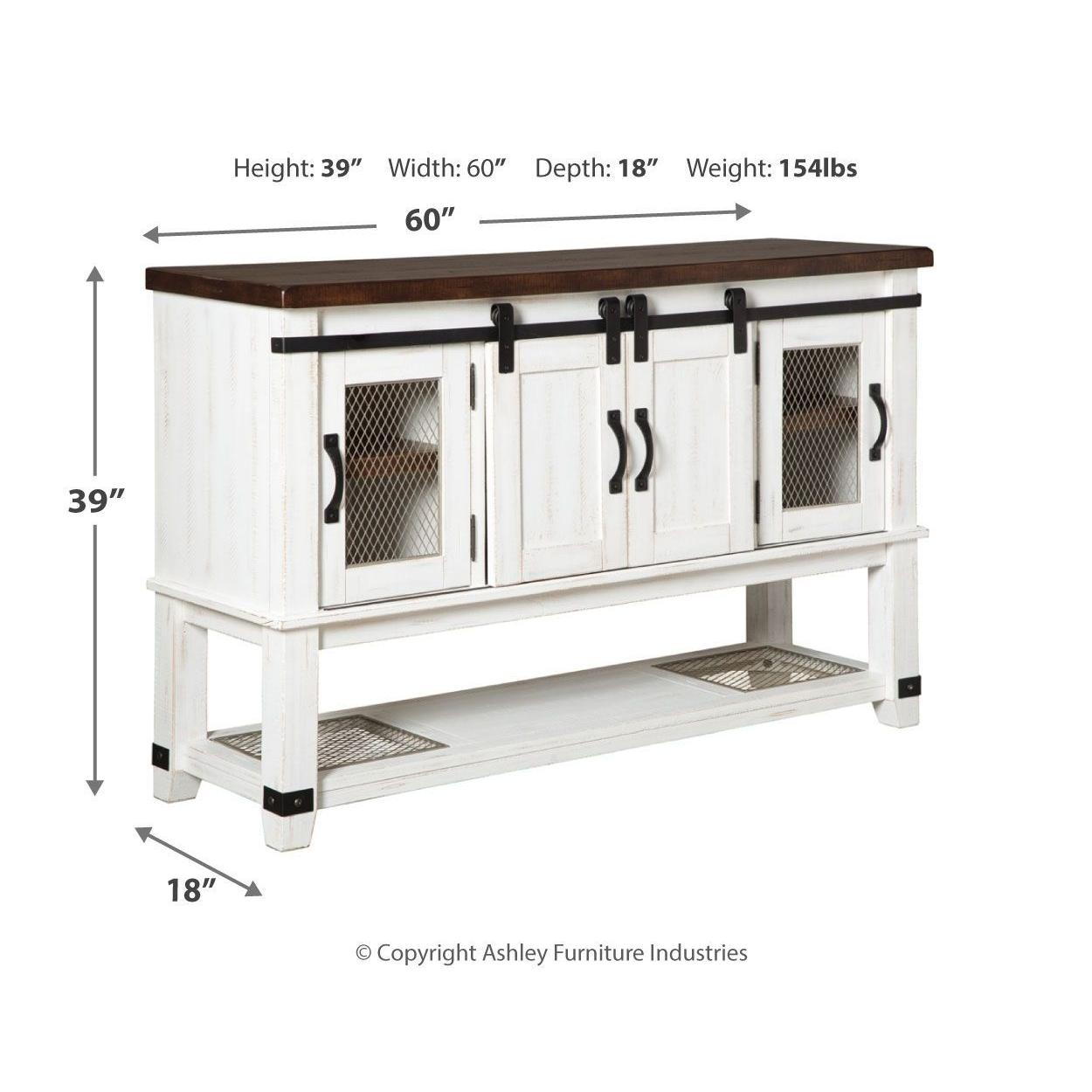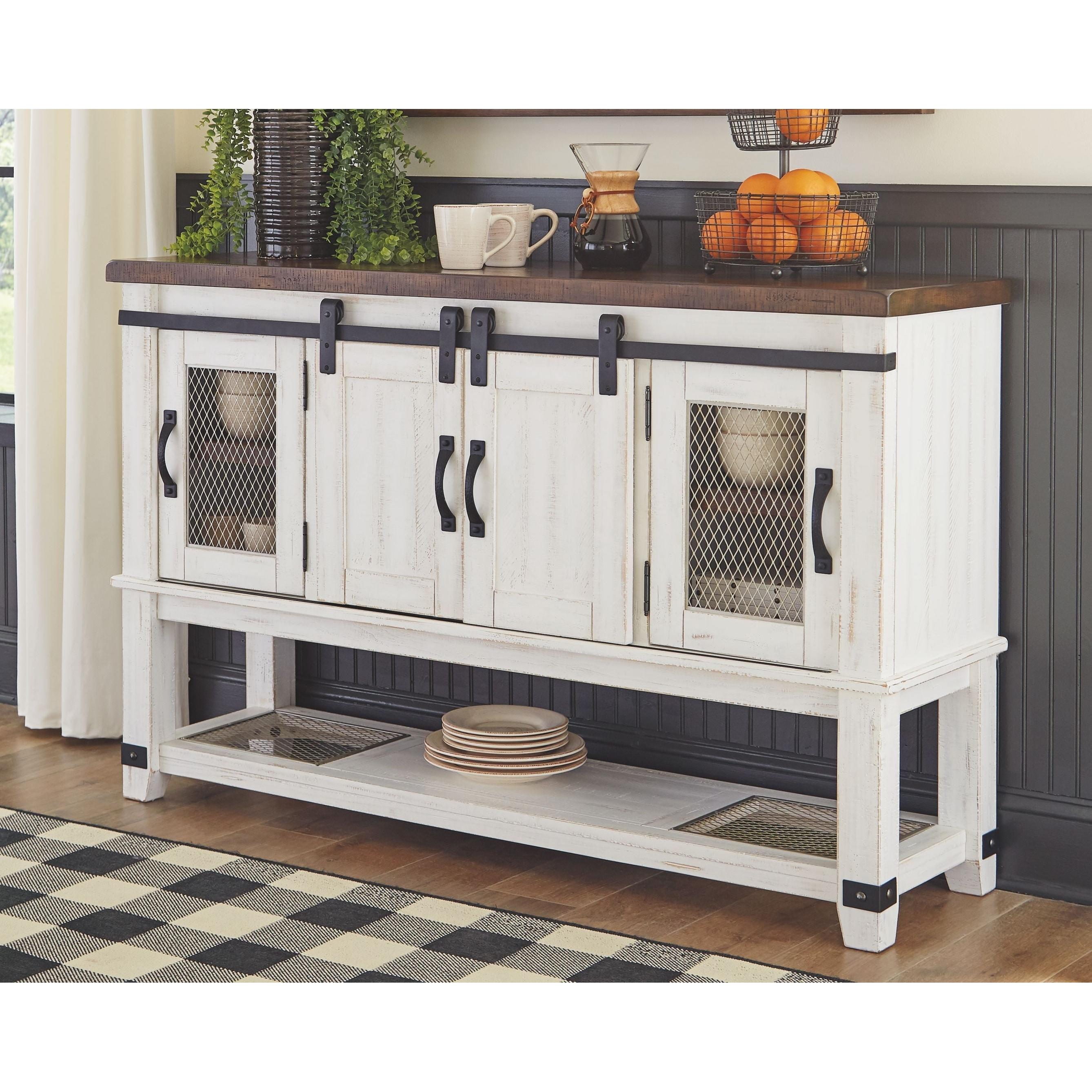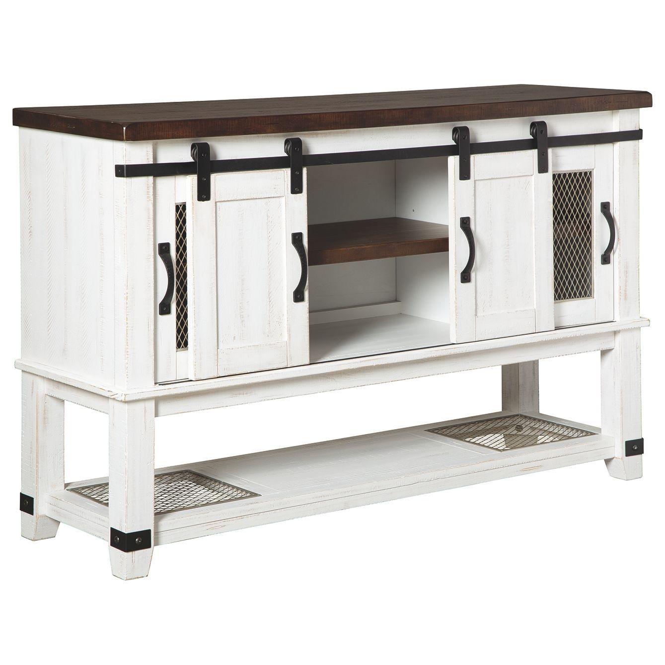 To those with an appetite for rustic farmhouse living, this server dishes out irresistible form and function. Pair of cabinet doors with mesh wire inlays add a countrified cool element. Sliding "barn doors"revealing even more shelved storage are right on trend. This server's two-tone aesthetic pairs a distressed vintage white with an aged natural pine color top for twice the charm.