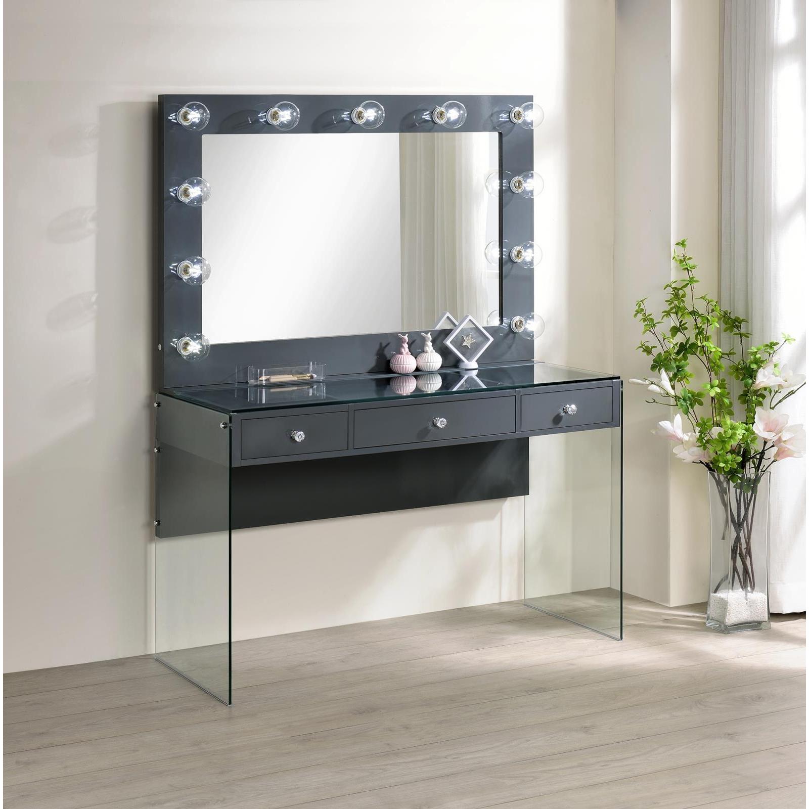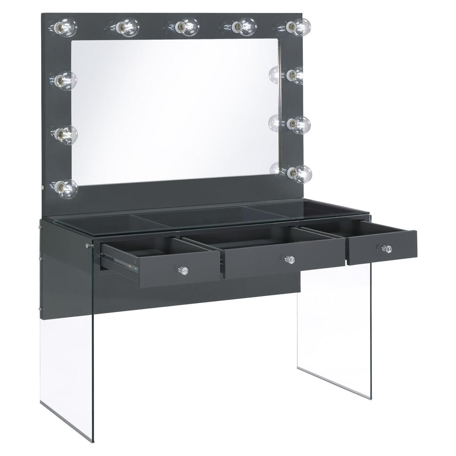 Add a bold, dramatic touch with this modern vanity set. complete with a smooth, grey high gloss lacquer finish across the tabletop and mirror frame, this vanity matches a variety of color palettes. supported by clear tempered glass side panels, the vanity appears to float in midair, leaving an open and airy flair. continuing the glass feature is a clear tempered glass top that showcases accessories and cosmetics inside the three drawers. the oversized mirror also offers ample lighting with eleven retro-like globe shaped bulbs.