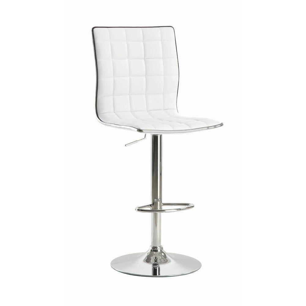 Gleaming chrome accentuates the clean, modern silhouette of this adjustable barstool. its armless seat boasts a full back with waffle texturing created with intersecting lines for a dimensional look. delivering appealing comfort, the barstool includes a height adjustable seat that accommodates various counters and bar tables. cool white upholstery with a leather-like look reinforces a clean, contemporary profile. a pedestal base shows off a gleaming chrome finish and includes a built-in footrest for optimal comfort.