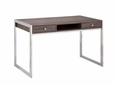 Built with just the basics, this writing desk delivers cool, stylish sophistication. minimalist design elements add a refreshing touch for a space that gravitates toward modern. with a weathered grey finish desk unit, it brings a cool, neutral palette. take advantage of an open center compartment between two drawers with full extension glides. steel square frames on each side offer a balanced look.