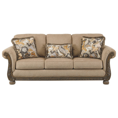 This sumptuous sofa takes traditional style in a new direction. Loaded with flair, the dark-finished exposed frame with artful detailing has us yearning for yesteryear, while clean-lined box cushions infuse a more contemporary element. Wrapped in a richly neutral chenille upholstery and accented with jacquard paisley pillows, this instant classic sofa takes the past right into the present.