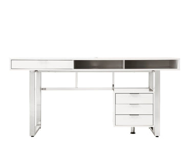 This contemporary writing desk is as functional as it is fashionable. the desk features open storage compartments beneath the desktop and four drawers with full extension glides. it's constructed with long-lasting steel, mdf, particle board, and engineered veneer with a chromed steel frame. the desk top is roomy enough for all writing and research needs, like a dictionary and thesaurus, laptop or pc monitor, and illuminating lamp. it's the perfect inspiration piece fit for any type of office space.
