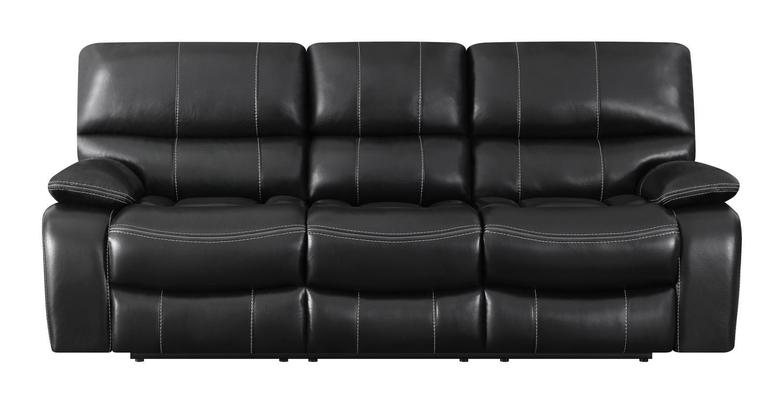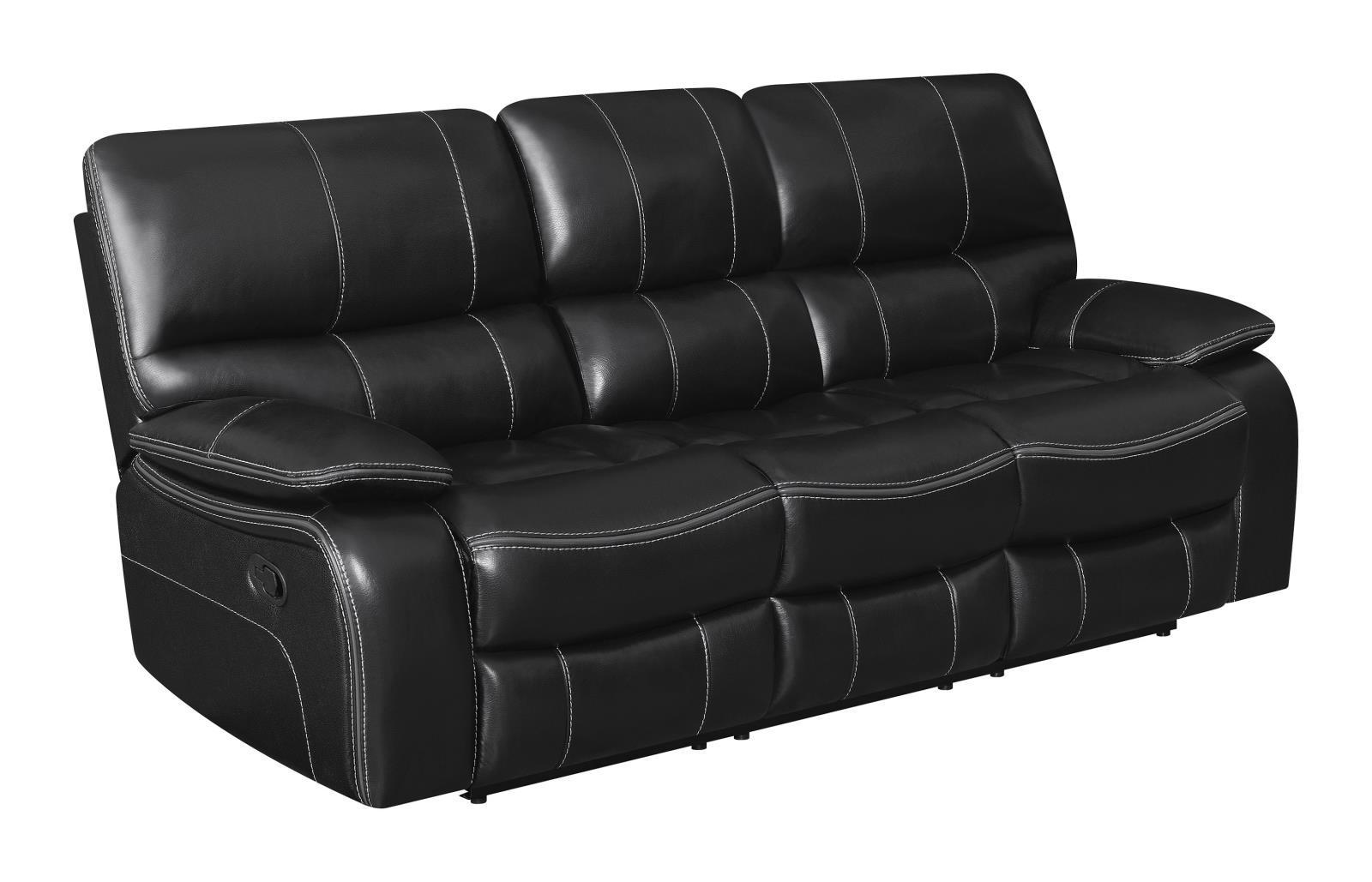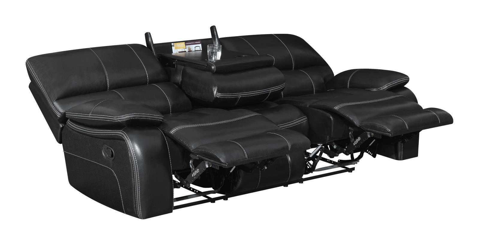 With soft, cushiony comfort and loads of convenient features, this motion sofa is sure to delight. with cushioned lumbar support, it creates a soothing space for restful relaxation. smooth, black, leather-like upholstery gives it a luxurious look and feel. reclining seats allow you and your loved ones to comfortably rest your feet. complete with a versatile, drop-down table, this sofa is endlessly appealing.