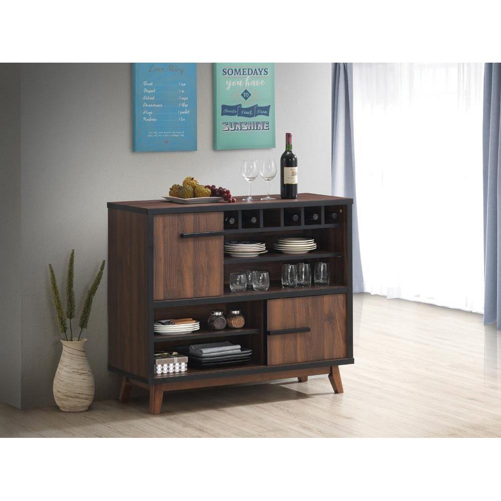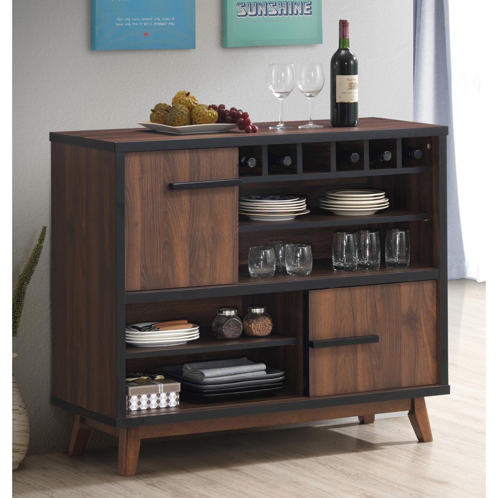 Infuse your decor with the vintage inspired appeal of this mid-century modern wine cabinet. delicate wines will be kept safe and sound in the built-in wine holder with space for six bottles. two sliding cabinet doors keep belongings concealed and neatly tucked away. six shelves offer all the space you need to keep cocktail party essentials in one place. from the rich walnut finish to the bold black accents to the eye-catching angled legs, this stylish piece exudes classic character and charm.