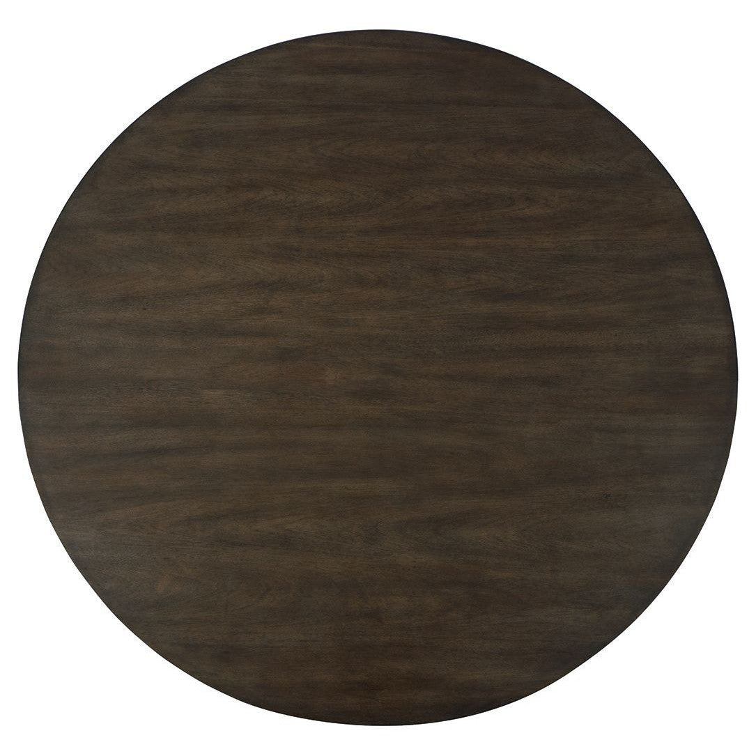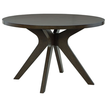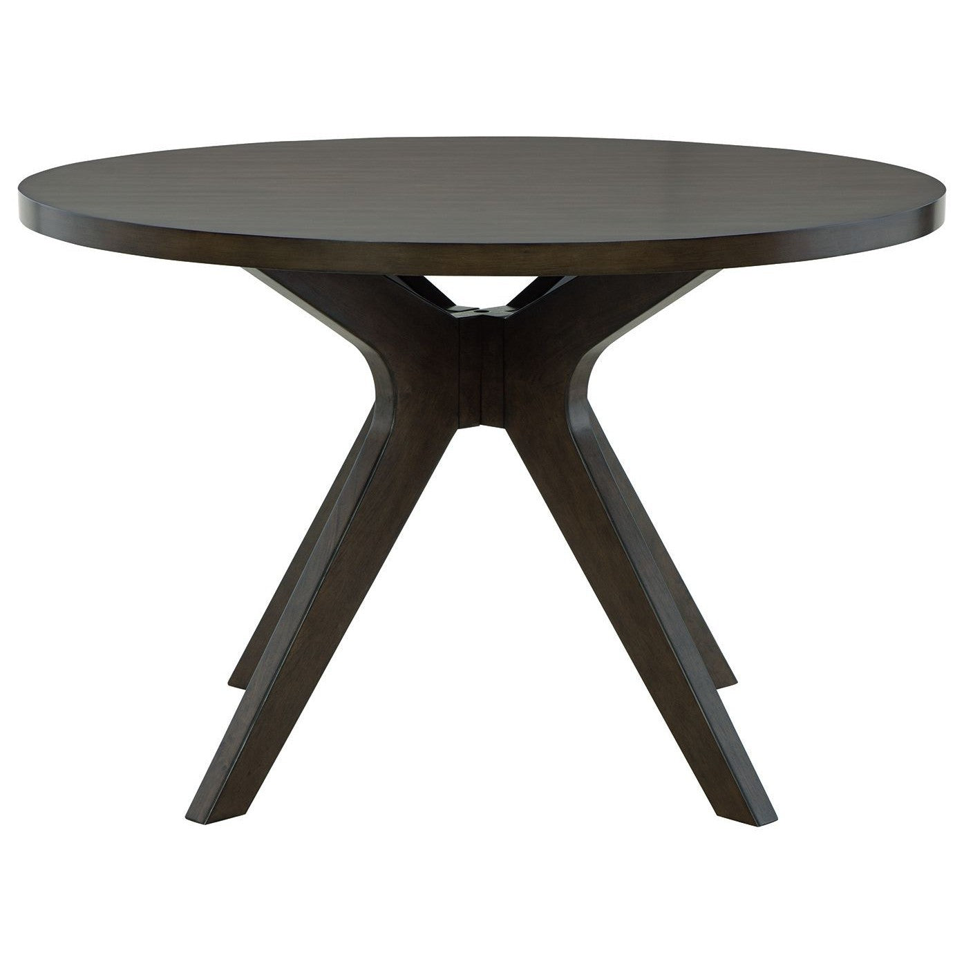 A beautiful balancing act. Clean lined and simply striking, this round dining table merges a high-style look with a side of easygoing attitude. Wowing with visual texture, the pedestal base with four tapered, splayed legs offers an architectural look with unique appeal. What a delicious choice for a casual contemporary dining room upgrade.