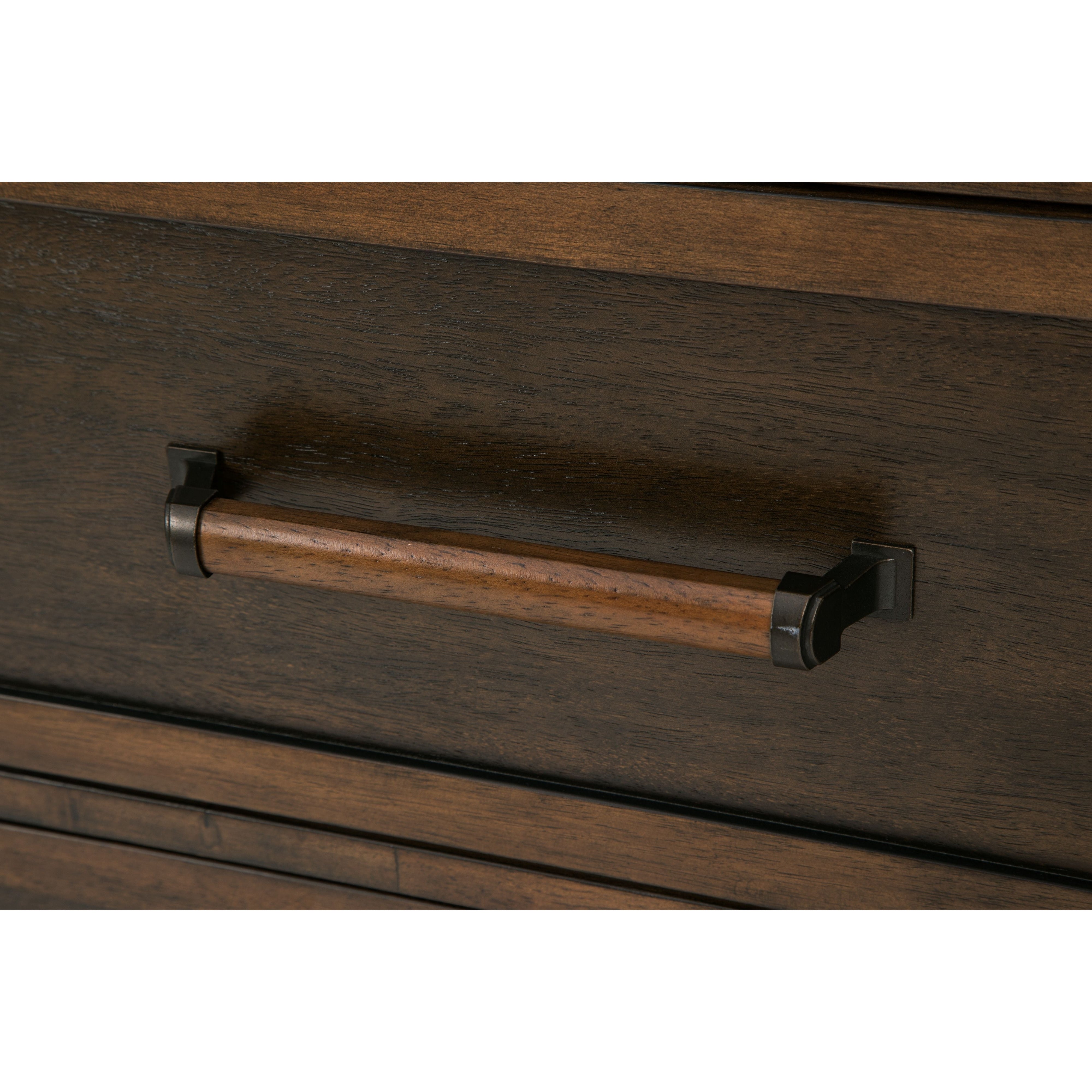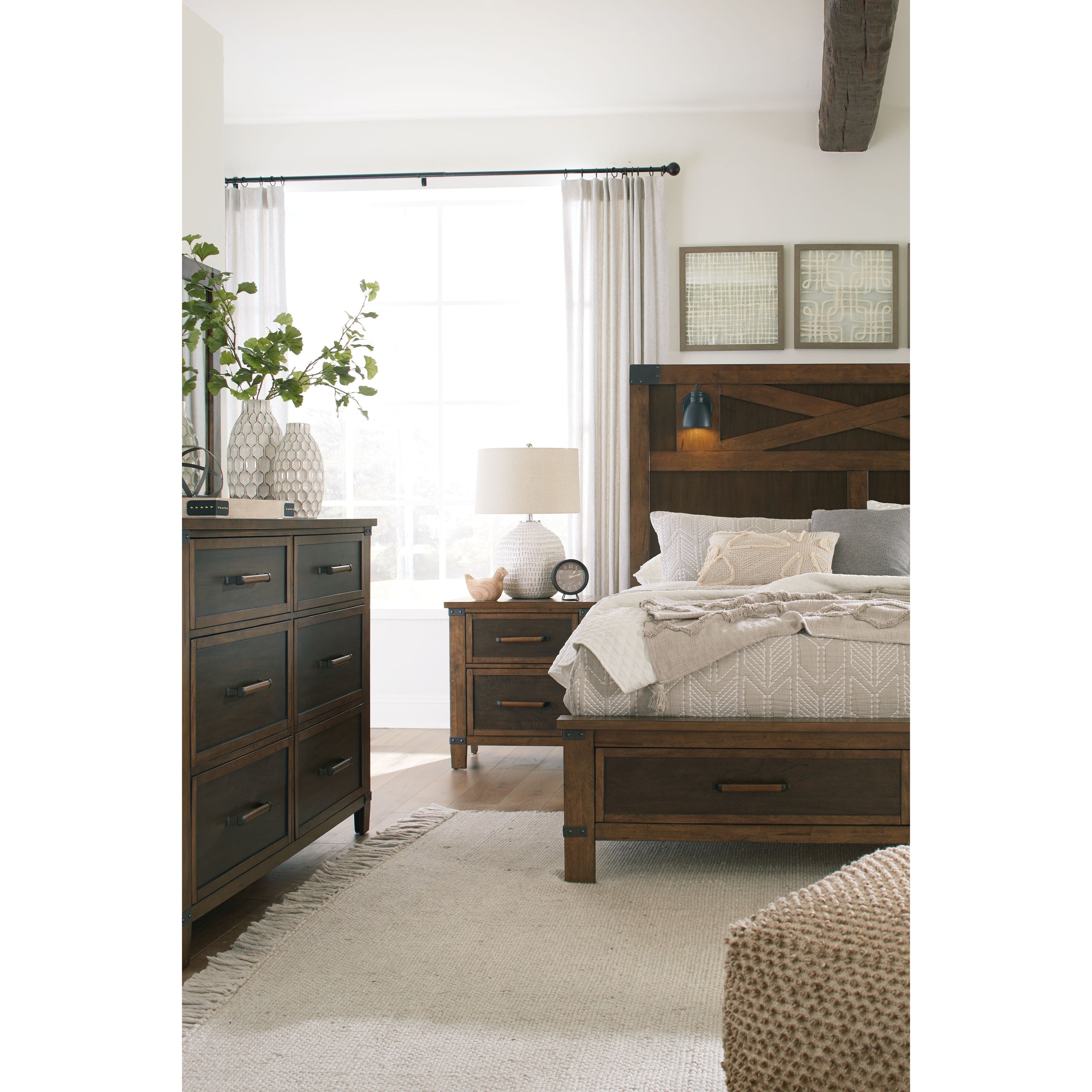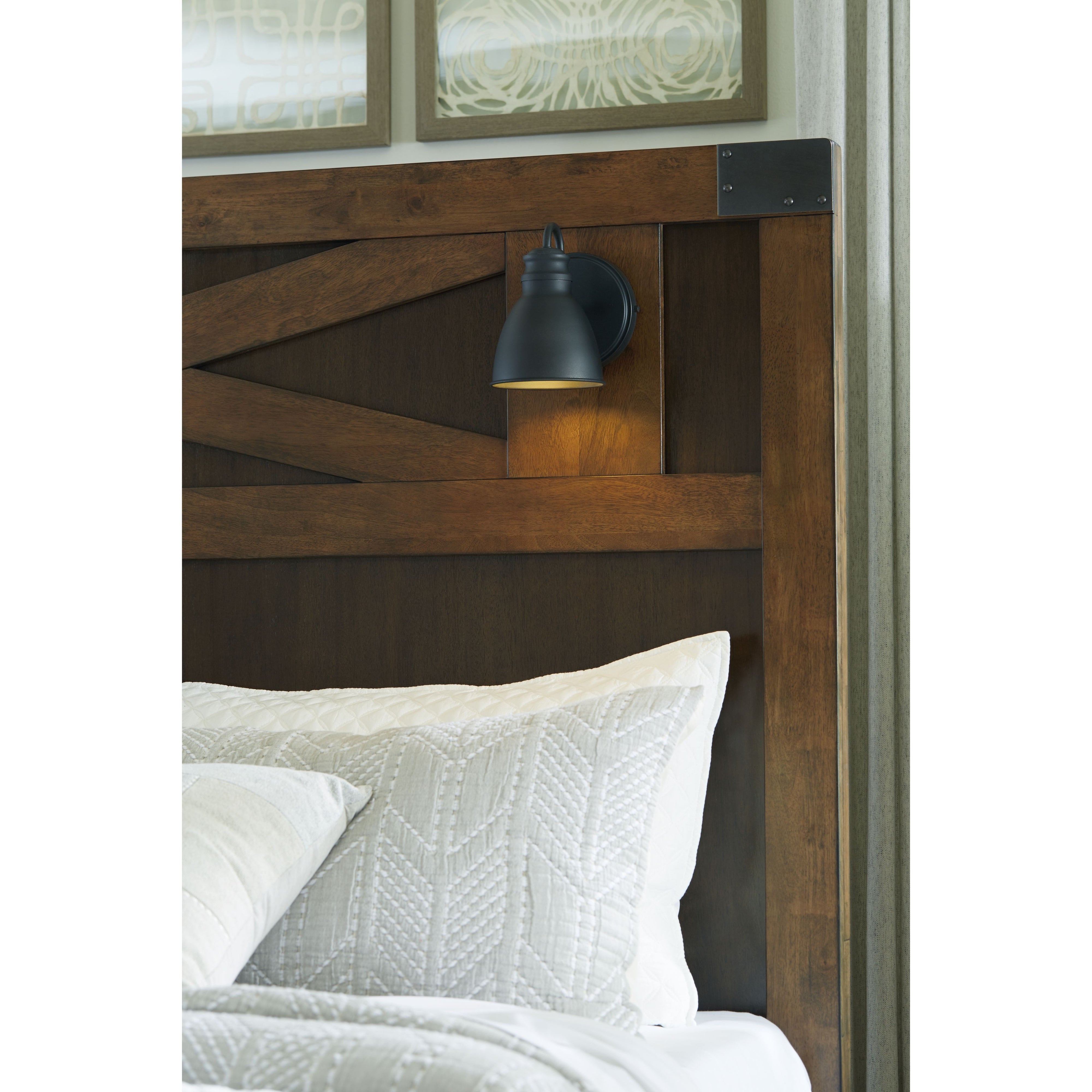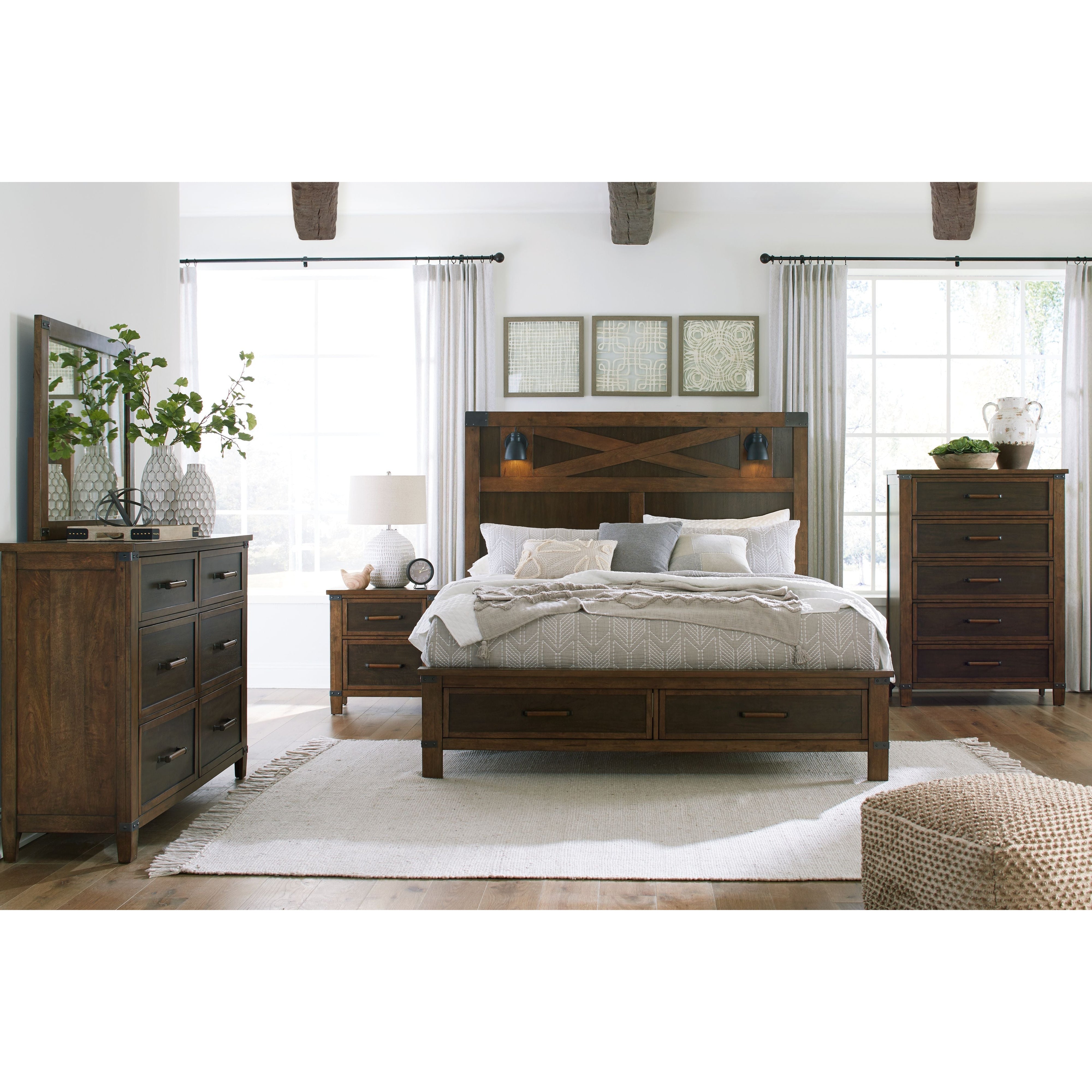 Casual two tone styling. Made with solid wood and Mango veneer. Finished with a walnut brown coloration accented with a dark burnt umber bed panels and drawer fronts. Panel bed with cross buck details with two overhead sconces for reading or ambient light. Well proportioned cases feature fully finished drawer boxes with dovetail construction and ball bearing side glides. Custom designed wooden bar pulls with metal keepers. Night stand includes a 110V power supply with dual USB charging ports. Upper drawers have black felt bottoms.