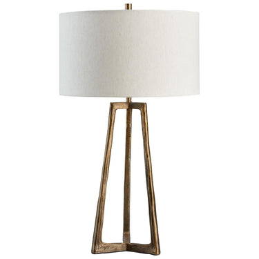 With its structural metal base and antiqued brass-tone finish, this table lamp takes a decidedly different stance on style. Whether you're a fan of vintage chic or industrial hip, it's an illuminating choice.