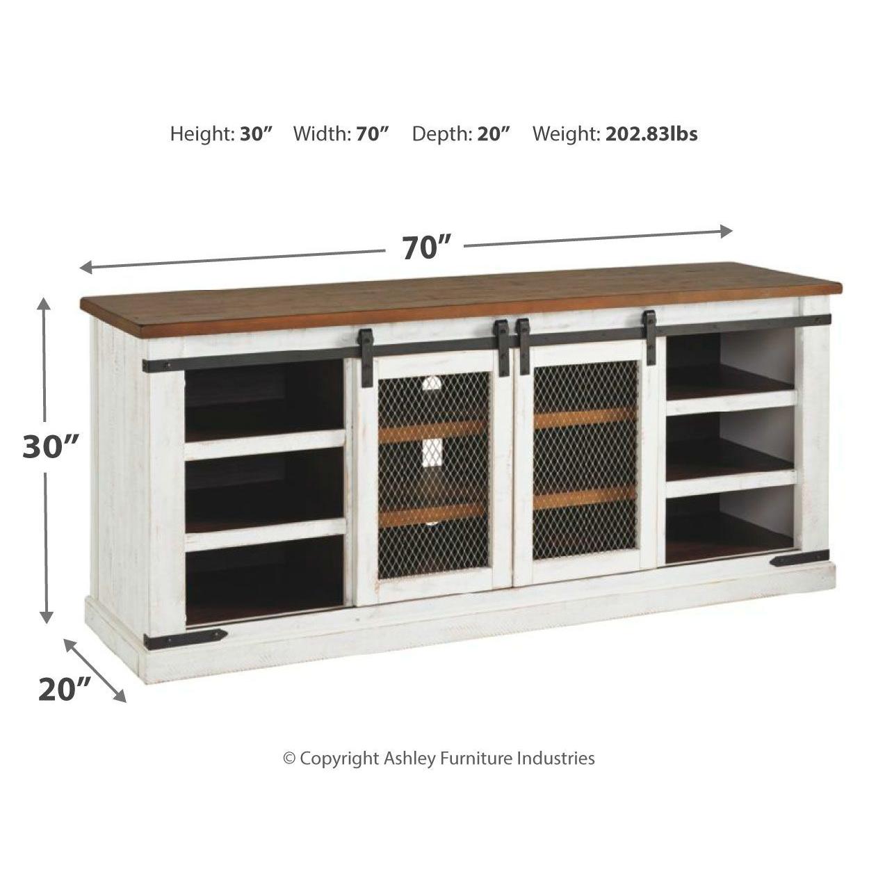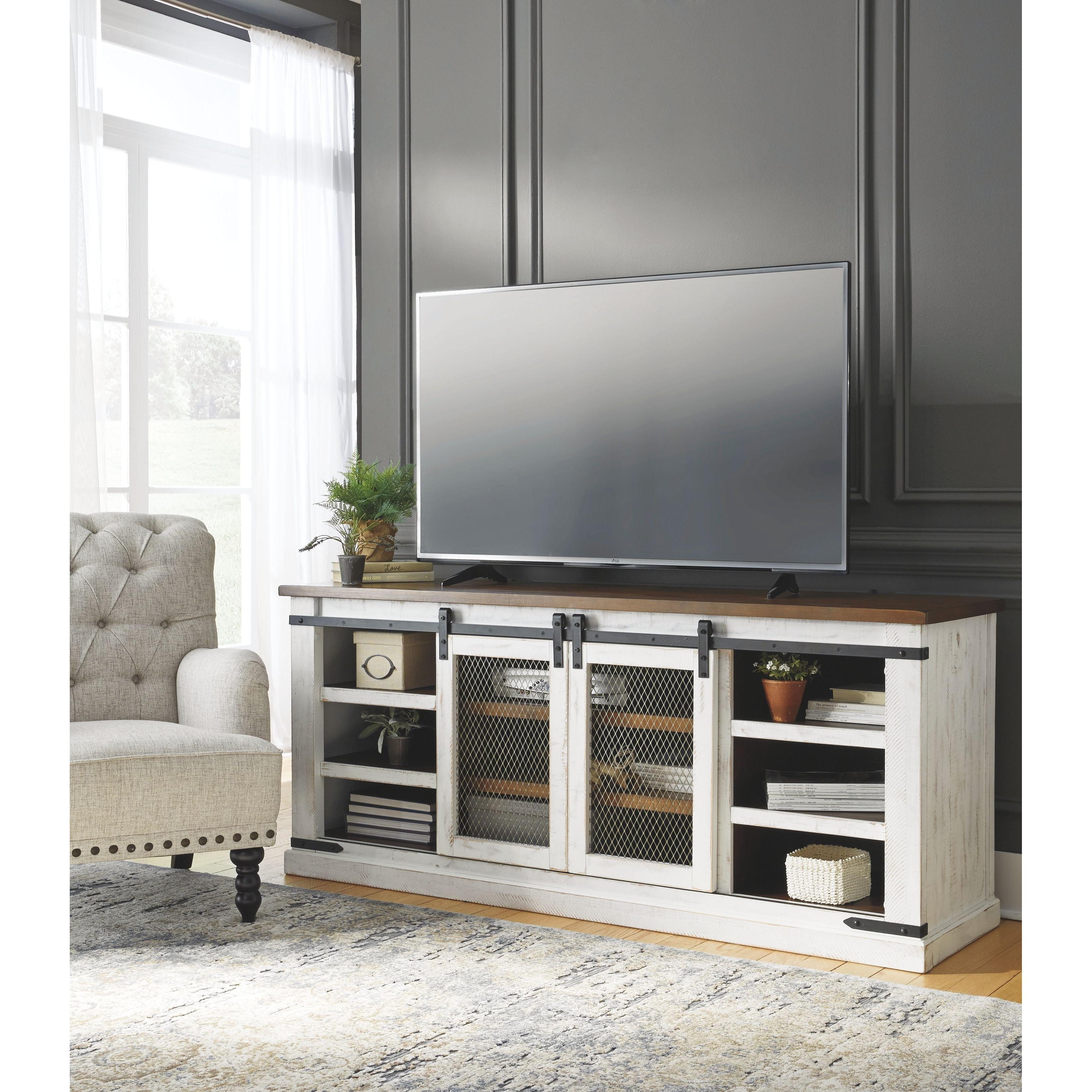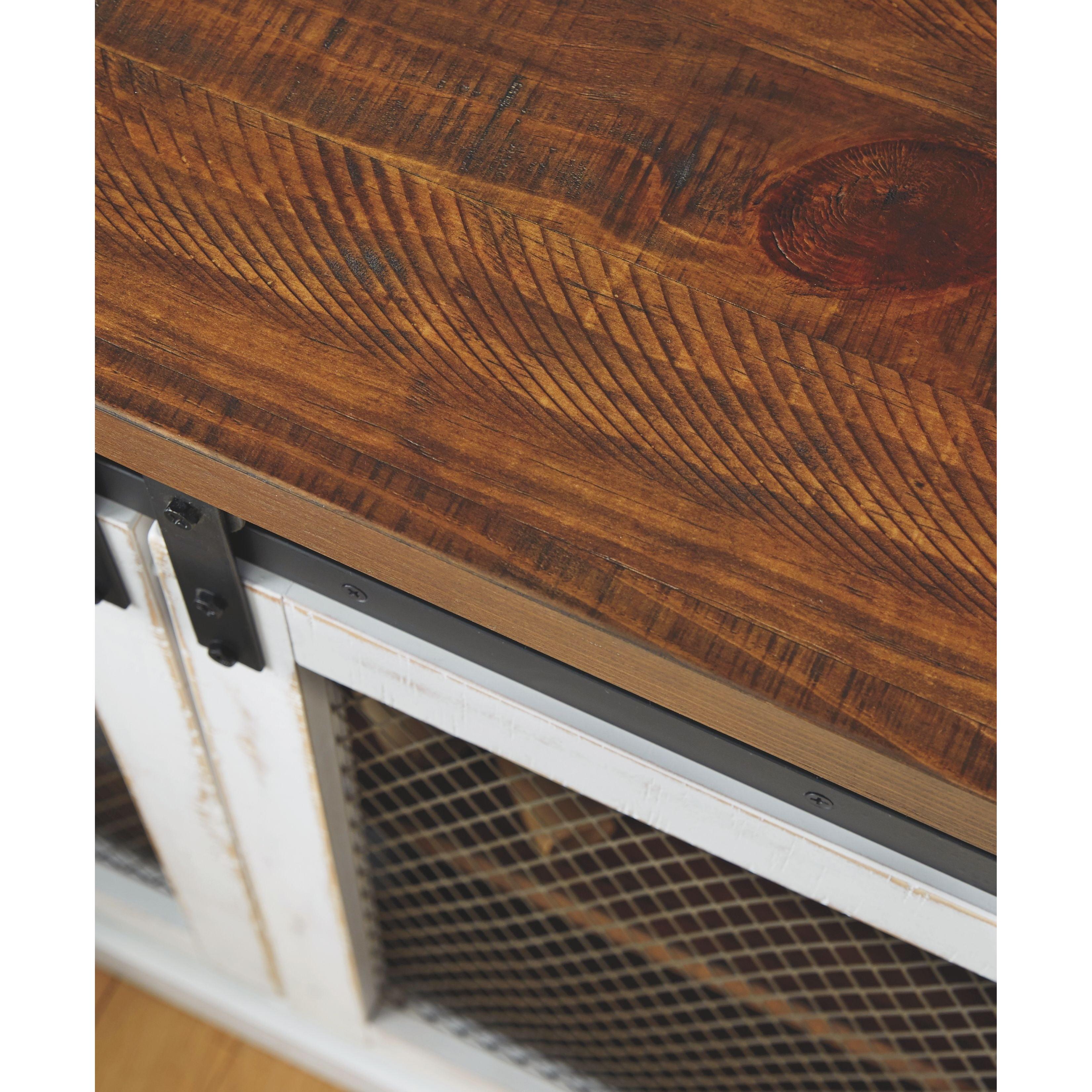 Double take. Sporting a two-tone finish that pairs a distressed vintage white with an aged natural pine-color top and shelves, this TV stand elevates the art of rustic farmhouse living. Enhancing its charm: sliding barn doors with inset metal grills and antiqued gray industrial hardware.