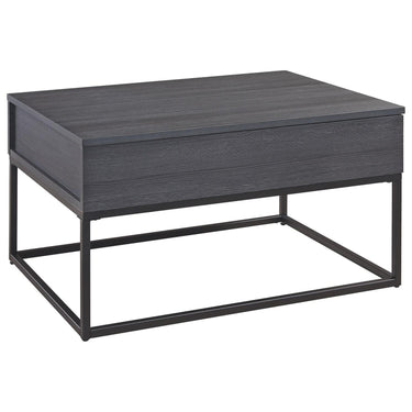 This cocktail table offers a casual, contemporary look for modern living. This piece provides a functional lift top design as a small space living solution. It has a replicated blackened wood finish with a grayed, textural grain for a classic look. The metal base elevates the table to create open space that adds a sense of lightness to your room.