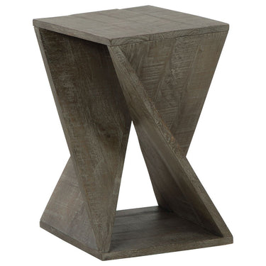 This accent table puts a new twist on vintage casual. Its gray finish is delightfully distressed, drawing attention to the saw mark planks arranged in an open architectural design. Place this unique piece next to a cozy chair to create a charming reading nook overflowing with visual intrigue.